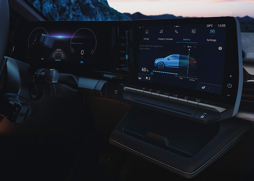 Interior: Pantalla táctil central de 12 pulgadas, espacio optimizado con piso plano y capacidad de maletero de hasta 440 litros.
